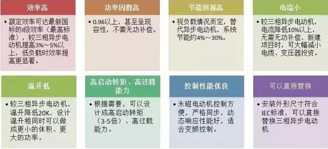 2 、高效永磁同步电动机永磁同步电动机与感应电动机相比,不需要无功励磁电流,可以显着提高功率因数(可达到1,甚至容性),减少了定子电流和定子电阻损耗,而且在稳定运行时没有转子铜耗,进而可以减小风扇(小容量电机甚至可以去掉风扇)和相应的风摩损耗,效率比同规格感应电动机可提高2~8个百分点。而且,永磁同步电动机在25%~120%额定负载范围内均可保持较高的效率和功率因数,使轻载运行时节能效果更为显着。这类电机一般都在转子上设置起动绕组,具有在某一频率和电压下直接起动的能力。目前主要应用在油田、纺织化纤工业、陶瓷玻璃工业和年运行时间长的风机水泵等领域。