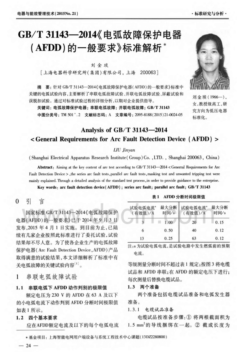 Analysis of GB/T 31143-2014 General Requirements for Arc Fault Detection Device (AFDD)