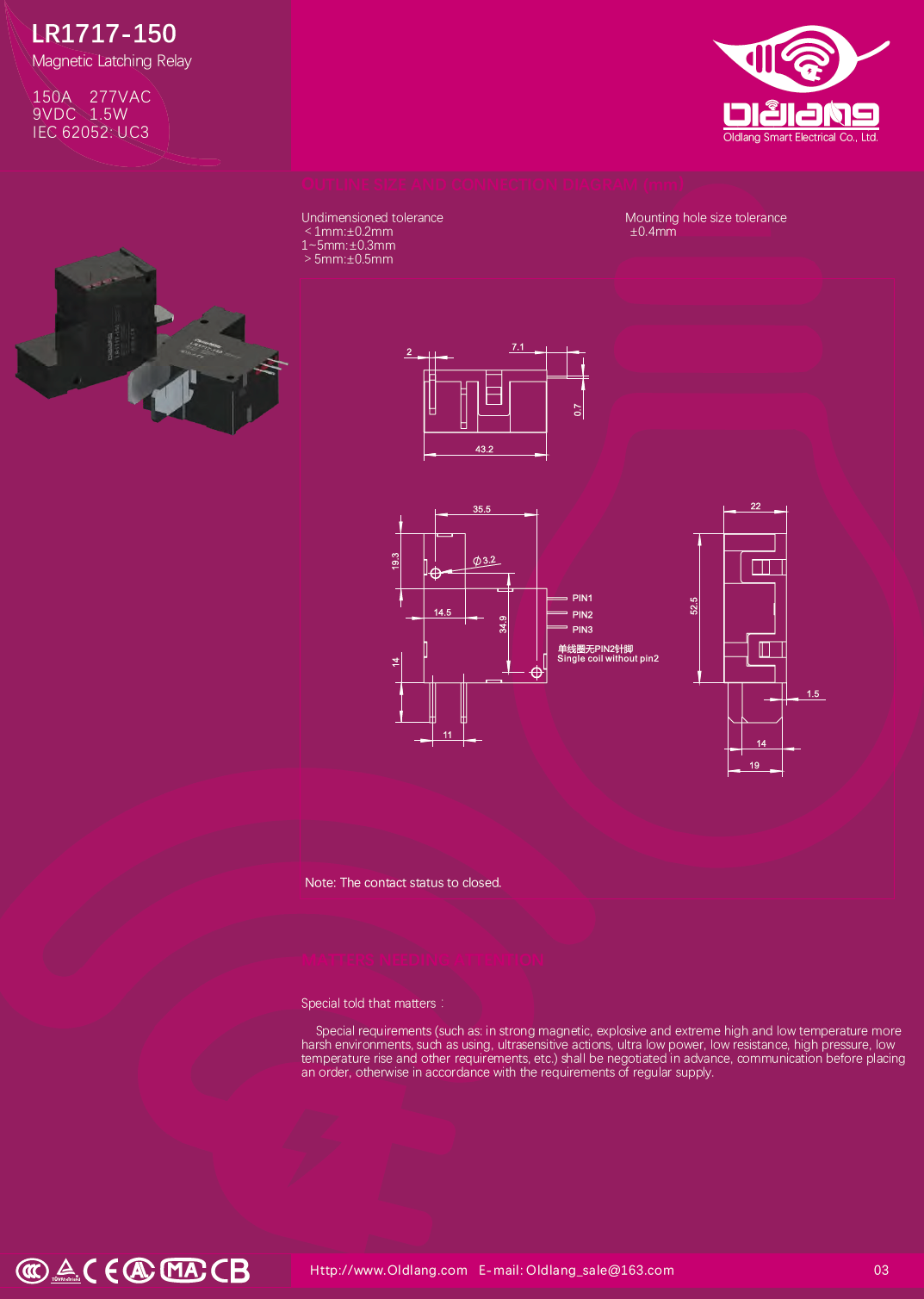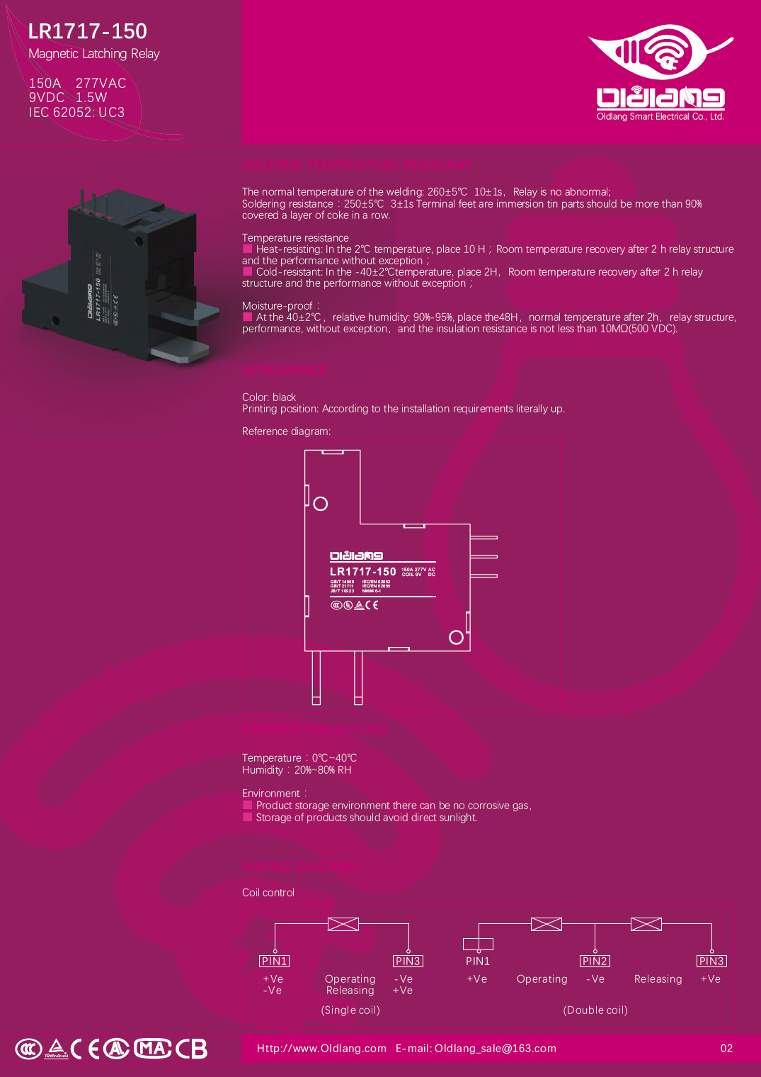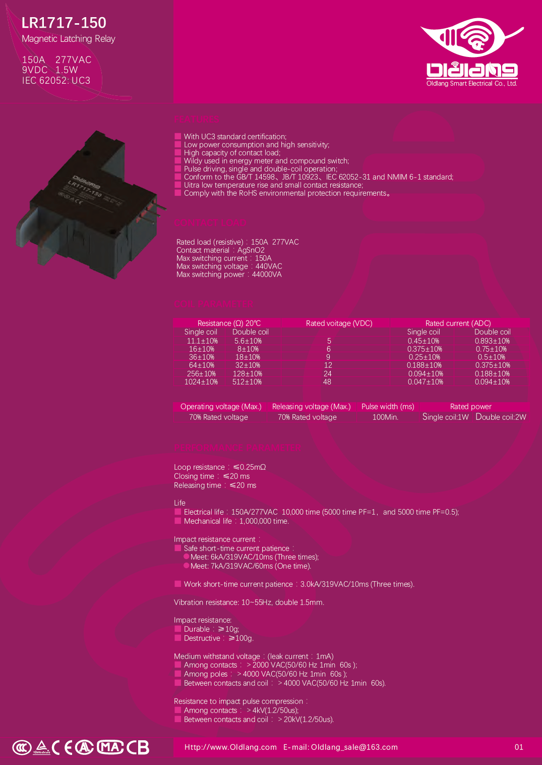LR1717-150 Magnetic Latching Relay IEC/EN 62052,IEC/EN 62055,NMIM 6-1,JB/T 10923,GB/T 14598,GB/T 21711 150A,277VAC,9V,1.5W,UC3